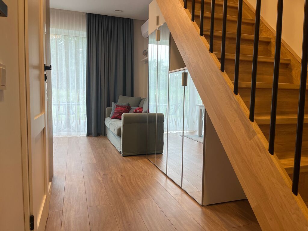 Parduodamas naujos statybos uždarame komplekse modernus, įrengtas 1 kambario butas su visais baldais, terasa (po pridavimo galima įsirengti, su vaizdu į baseiną!!!) su baseinu, pirtimis, vaikų žaidimo aikštelėmis.